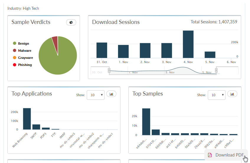 Sample Verdicts, Download Sessions, Top Applications, and Top Malware