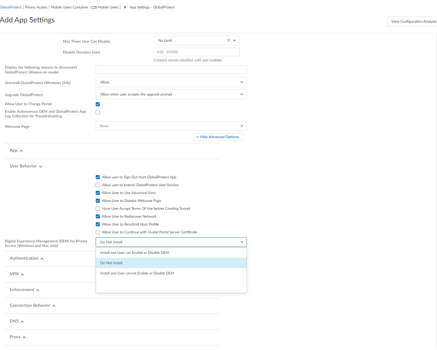 App tab, enable Autonomous DEM endpoint agent for Prisma Access