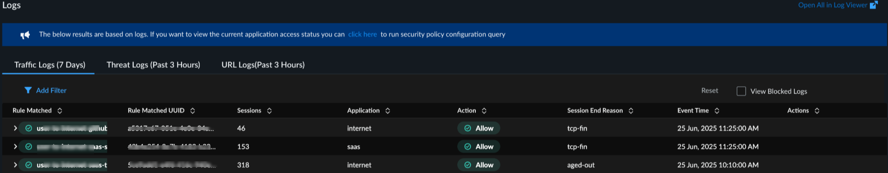 - Your query result shows a historical sequence of events related to the user's access over time. Click the query name from Query Log to view the results.Under Results, click Security Policy (Based on Logs) to view logs that matched the rule. Access Analyzer displays traffic logs for the past seven days, and threat and URL logs for the past three hours.