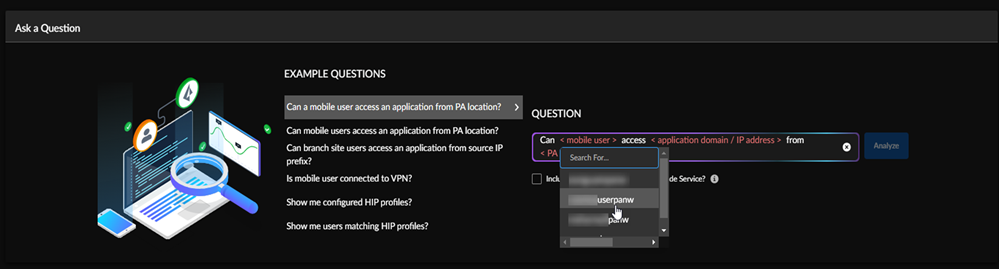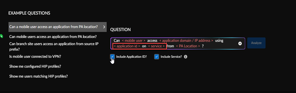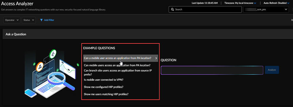 - In Strata Cloud Manager, go to InsightsAccess Analyzer, and select an Example Question.You can also start an Access Analyzer query from Copilot.