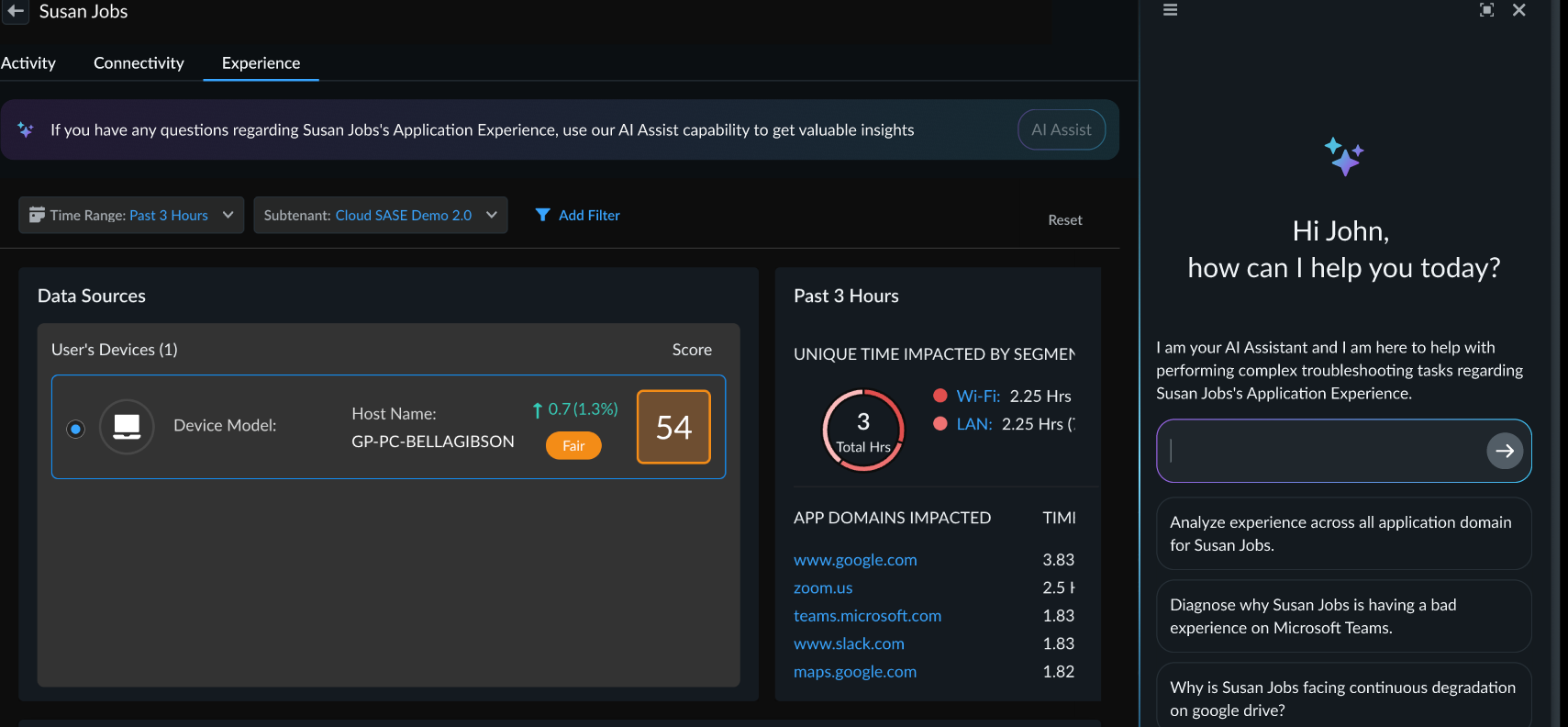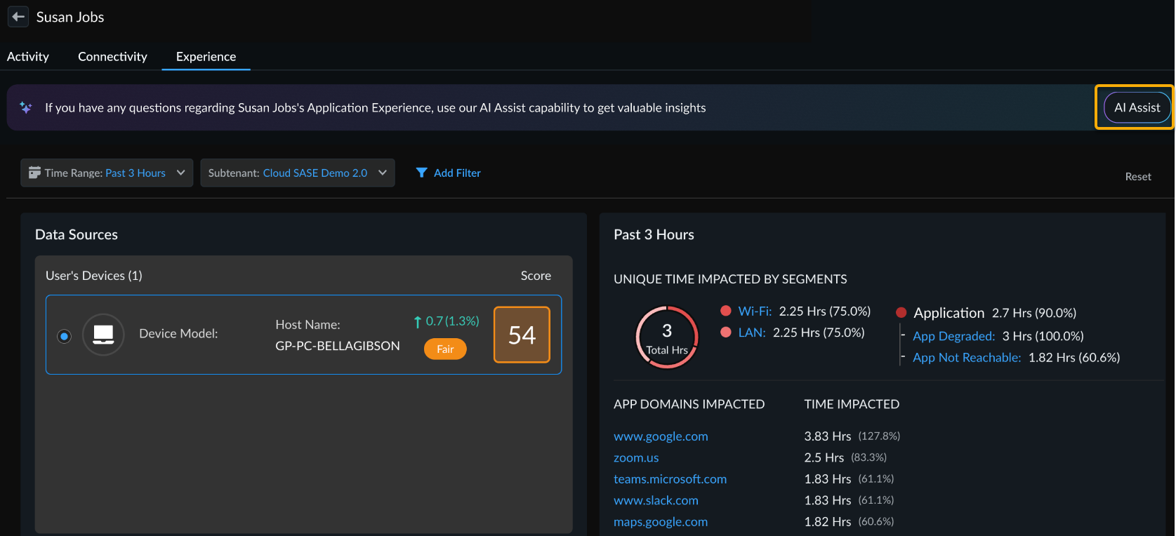 Follow these steps to use the AI Assist feature within Strata Cloud Manager for diagnosing and troubleshooting user application experience issues.
