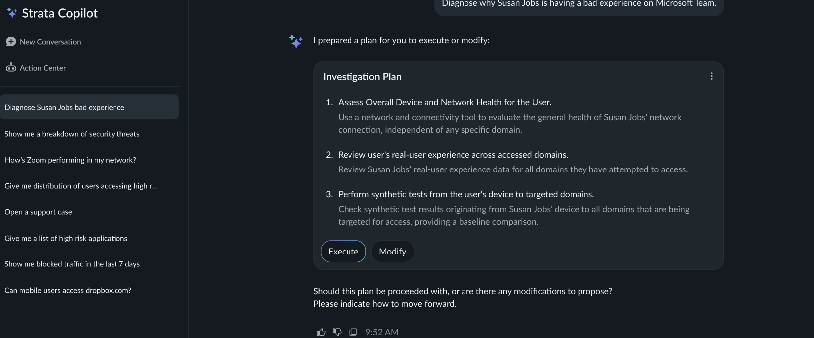 • Select a pre-suggested prompt, such as "Diagnose why Susan Jobs is having a bad experience on Microsoft Teams.". Select the query and click Modify to update the query before you execute it.