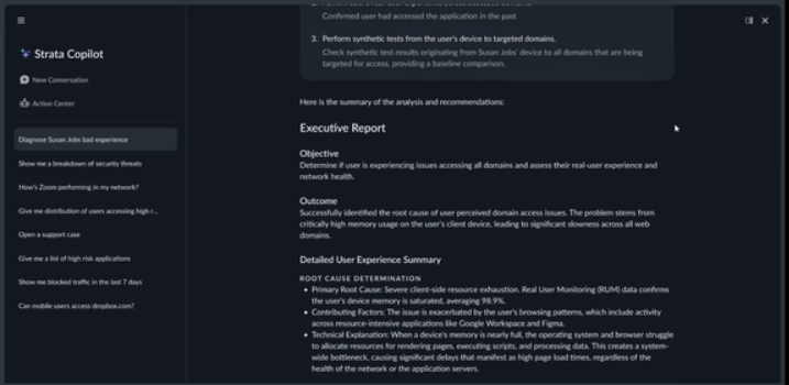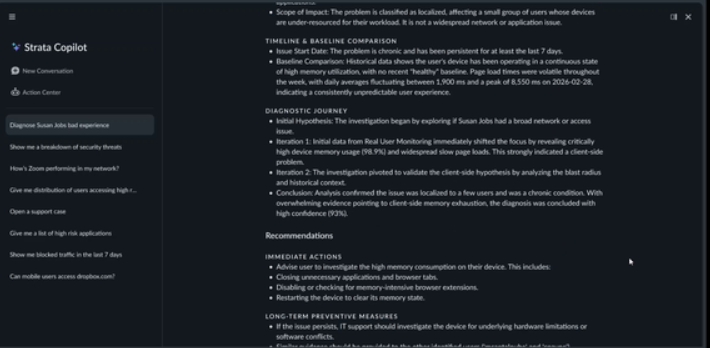 • Root cause determination - AI Assist correlates findings across all domains to identify the true root cause rather than just the most visible symptom. For example, critically high memory usage on the user's client device.
