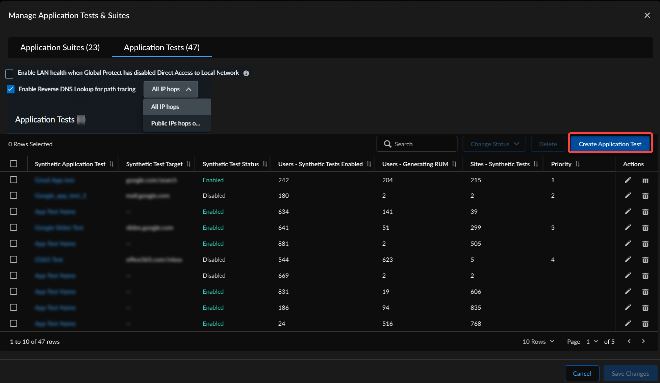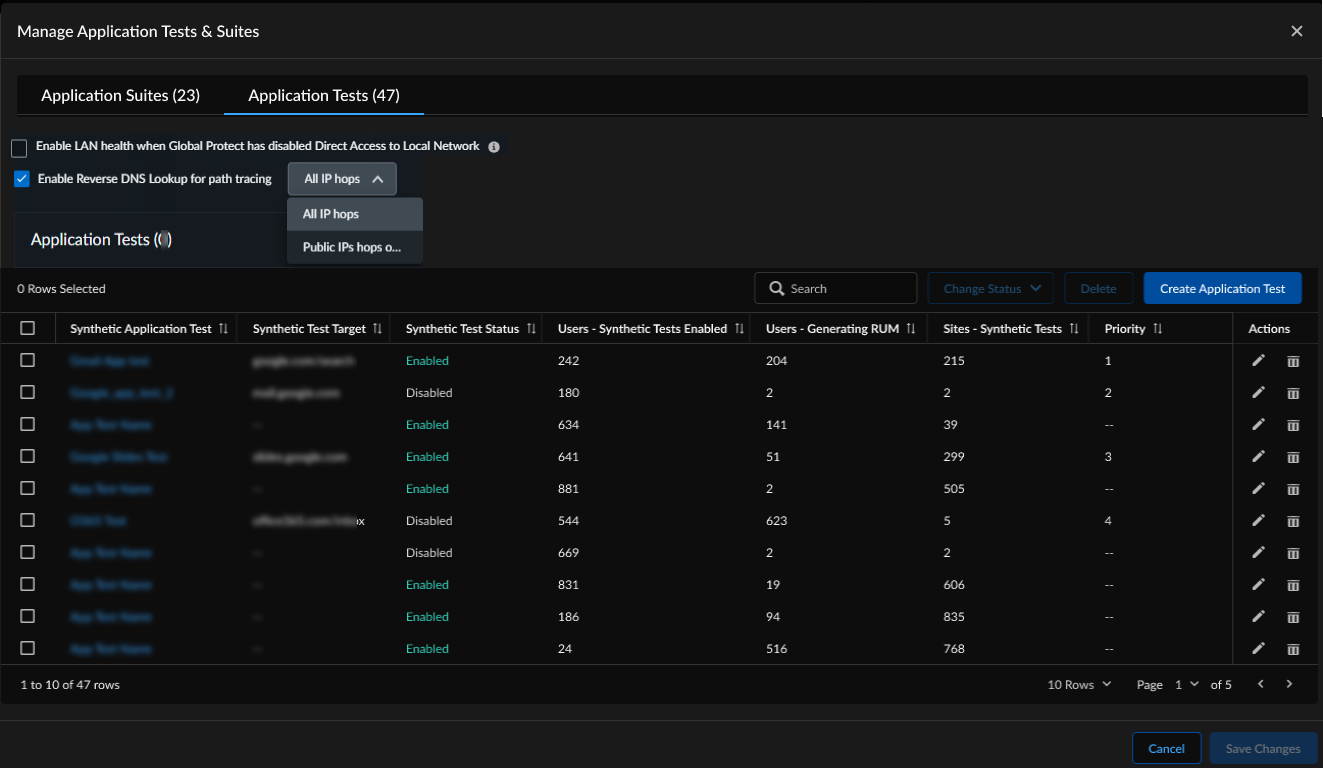 If your security policy is set to 'application-default' under 'Service/URL Category' or 'APPLICATION / SERVICE', your traffic may be getting dropped, causing traceroute to not run successfully. Update this field to 'any' so that any port can be used.If you select the Split Tunnel option in the Network Options section, along with selecting the Enable per hop performance metrics option, you will not be given the option to select a Protocol. When you select Split Tunnel, the protocol for split tunnel applications will be chosen based on the operating system where the access experience agent resides. The Windows agent will run TCP-based traceroute for split tunnel applications, hence the Protocol under Path Visualization defaults to TCP on Windows. The MacOS agents will run ICMP-based traceroutes for split tunneled applications hence the Protocol defaults to ICMP on MacOS.Remote Sites Test OptionsField Description Enable Application Experience monitoring on active and backup paths Select this option to run synthetic tests on both active and backup paths configured in the Prisma SD-WAN path policy. Enable Application Experience monitoring on active paths only Select this option if you want to monitor active paths only for the applications. (Requires SD-WAN ION version 6.4.2 or later and ADEM agent 3.4.7 or later)If you have configured SD-WAN path policy rules for your remote sites, you can configure your application test to run on the SD-WAN path that you’ve defined for your users. This ensures that you're monitoring the paths through which user traffic is actually flowing so that you can have a more accurate picture of application experience in your organization. The following optional fields enable you to run application tests on a specific SD-WAN path:Field Description Application Entities The App-IDs for the applications defined in the SD-WAN path policy rule that you want your application test to probe. Ensure that the App-ID you enter here corresponds to the application in the SD-WAN path policy rule on the ION device from which you want to run the test. If the App-ID does not match a rule on the device, the test will not run on that device.Network Context The network context for the applications defined in the SD-WAN path policy rule that you want your application test to probe. Source Prefix The prefix for the remote site originating the traffic as defined in the SD-WAN path policy rule that you want your application test to probe. If you leave these fields as ANY, then the application test will run on all devices specified in the application test configuration and possibly on a different path from that which you defined in SD-WAN path policy rules.Save the test.The tests get a priority assigned to them in the order that they were created.For example, the first test you create gets a priority order 1. The next test you create gets priority order 2, and so on. The tests are pushed to the mobile users and remote site according to the priority they are assigned. If the remote site devices have available capacity for the test, the test will be enabled. Otherwise, the remote site gets moved to the Excluded Remote Sites for the test.Even though the tests are assigned to both Mobile Users and Remote Sites, the priority in which the tests are pushed to the device is important particularly to the remote sites, since each device in a remote site is capable of running a different number of tests depending on the device size.So, if you have created a test, for example Test A which has a priority of 8, and attached it to multiple remote sites all of which can run Test A, if one of those sites, for example San Jose, has reached its limit on how many tests it can run, Test A will not be pushed to the site. That remote site (San Jose) will get moved under the Excluded Remote Sites column in the Application Tests table on the Application Tests page.But if you absolutely must run the Test A, you can change the priority of Test A from 8 to a higher location in the table, for example to the top of the list by clicking on the dots to the left of the check box and dragging and dropping it to the top of the list. Alternatively, you can select its check box and click the up arrow at the bottom of the page. You will see its priority change only after you click Save. Now Test A will get a higher priority and will be pushed to the San Jose remote site before the remaining tests that follow Test A in the table. This would mean though that the San Jose remote site will now be excluded in the configuration push from some other lower priority test (lower priority compared to Test A) that is pushed to it.View a summary of all the tests created in InsightsApplication ExperienceApplication Tests.