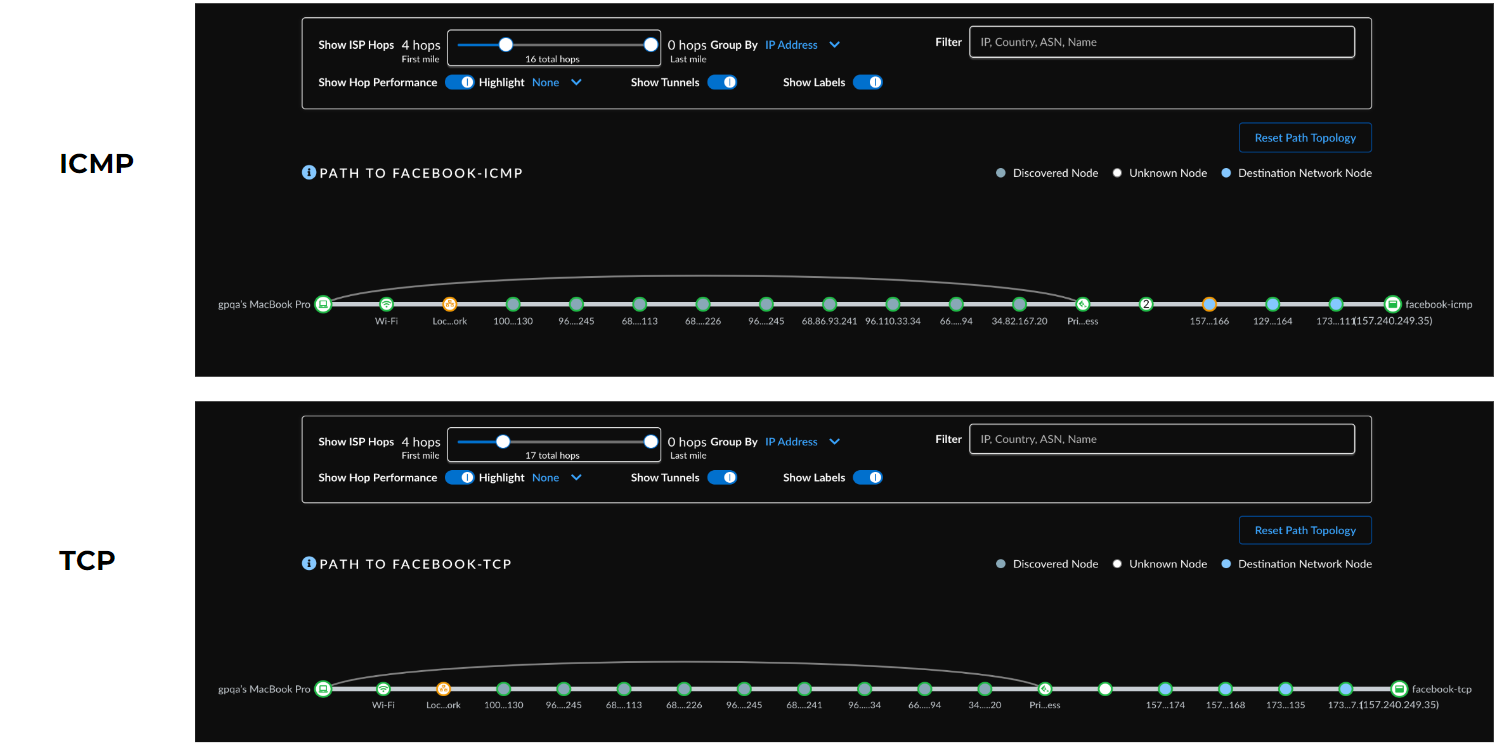 Under Path Visualization, TCP or ICMP can be selected as the protocol for traceroute. Here is an example of TCP vs ICMP based traceroutes. Results for TCP and ICMP traceroutes can vary, but sometimes they can be the same. In general, TCP-based traceroutes can provide less unresponsive nodes.