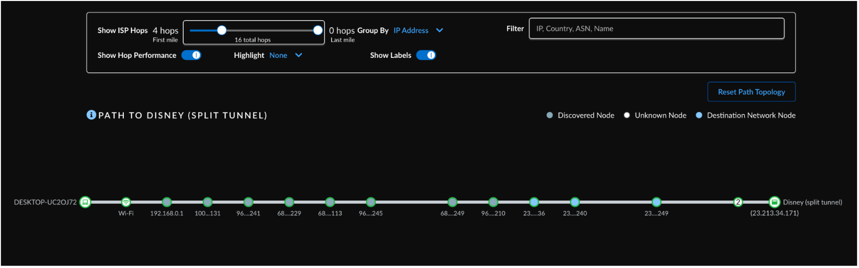 Here is an example of the Path Visualization widget for split tunneled applications. This is an example of when the Split Tunnel option under Network Test Options is selected along with the Enable per hop performance metrics option under Path Visualization.