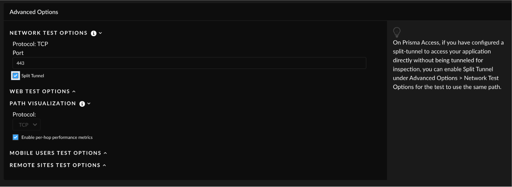 Set the Advanced Options:The options that you select in the Advanced Options section determine what you see in the Path Visualization widget. If the application has been configured in GlobalProtect to be split tunneled, select the Split Tunnel option in the Network Test Options section. To view the split tunneled traffic in the Path Visualization widget, enable the Enable per hop performance metrics option under the Path Visualization section.When creating tests for Zoom and Teams applications, be sure to set Split Tunnel to true and do not run the path tests.