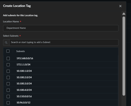 The Tags tab displays a table with existing office locations and their associated subnets. The table includes the location name and a comma-separated list of configured subnets for each location.Click Add Location in the top right corner of the table.Enter a unique Location Name, such as SantaClara Building1 or London Branch. Your system prevents duplicate names.
