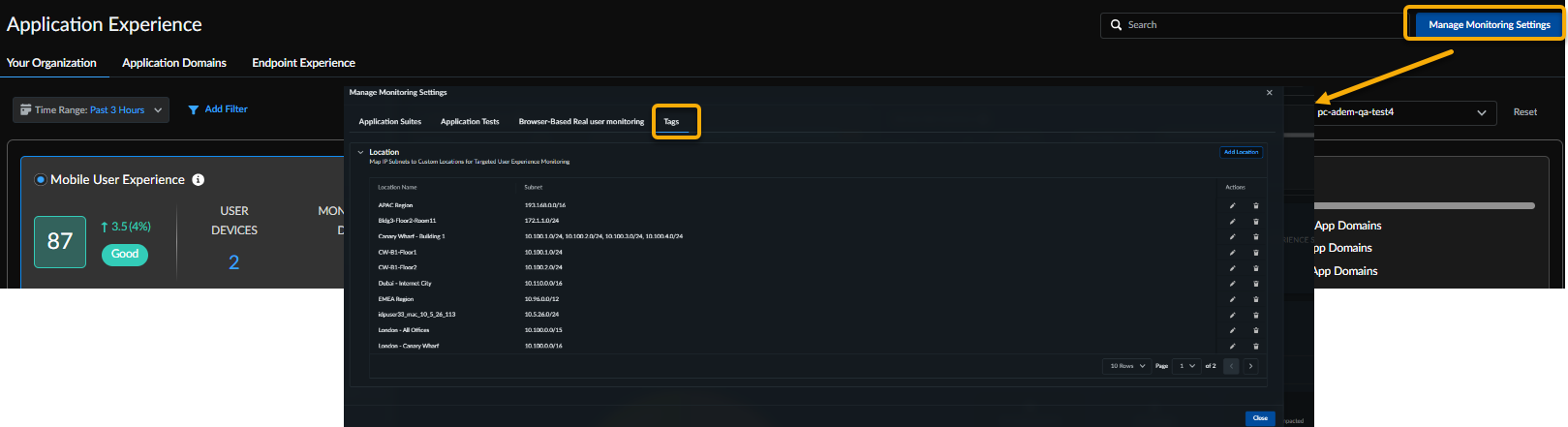 - Click Insights Application Experience > Manage Monitoring Settings in Strata Cloud Manager.Select the Tags tab.