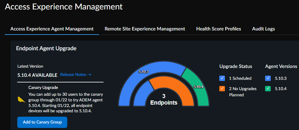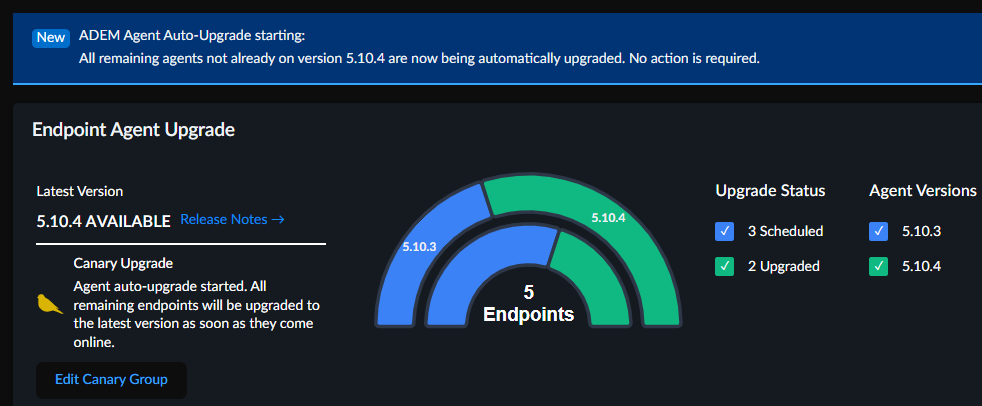 - Global Rollout (Day 30+): After day 30, the latest agent upgrade is made available globally. At this time all ADEM agents,including those not included in the Canary group are automatically marked for upgrade. This rollout occurs in a phased manner by region.