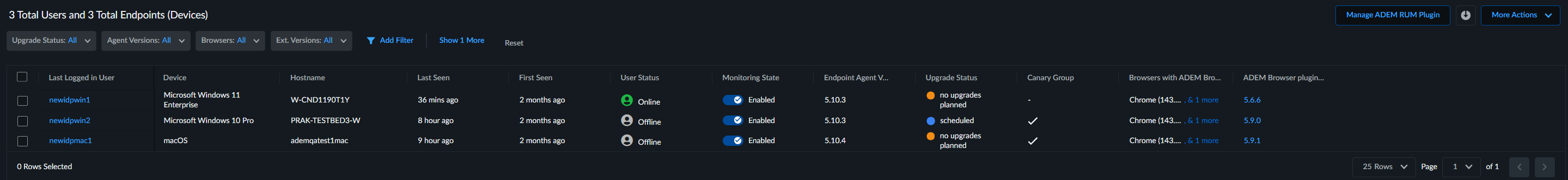 Review the Upgrade Status and Canary Group columns in the Users and Devices table.Toggle Monitoring State to enable or disable monitoring of a particular agent.For agents that require a manual upgrade, the Upgrade Status is shown as Manual Upgrade.Refine your view based on the upgrade status, agent versions, Canary user groups, mobile users, and browsers, browser plugin versions (for Real User Monitoring (RUM) scenarios) using the filters provided in the table.