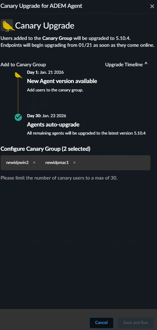 Define the criteria for the canary group, such as selecting specific users or groups to participate. Ensure users or user groups provide unique host IDs for effective participation.Click Save and Run.Add or Edit Users and Groups within a Canary group.- To add more users to an existing Canary group, click Add to Canary Group.The canary upgrade is limited to a maximum of 30 users per tenant. Any users or groups beyond the first 30 users are not considered for the Canary upgrade.