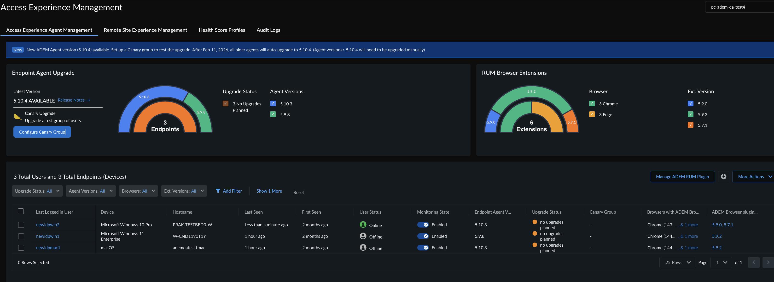 Monitor agent upgrade status from the Users and Devices table.- After day 30, the latest agent version is made available globally. At this time all ADEM agents,including those not included in the Canary group are automatically marked for upgrade. This rollout occurs in a phased manner by region.You are notified of successful upgrades, any emergency upgrades or if the upgrades are paused due to any issue found during testing in the Access Experience Agent Management, Application Experience, and Insights > Users pages.Access the Users and Devices table in the Settings > Access Experience Management page.