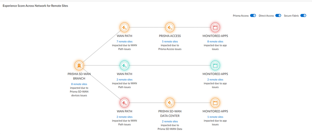 Monitor the digital experience of for your remote sites and troubleshoot performance issues from this dashboard. The page provides an experience score of all the remote sites in the Prisma Access Locations and shows the experience trend during the selected Time Range. You can also see detailed experience information for each remote site. This is often where you will want to start if you have remote sites reporting performance issues.