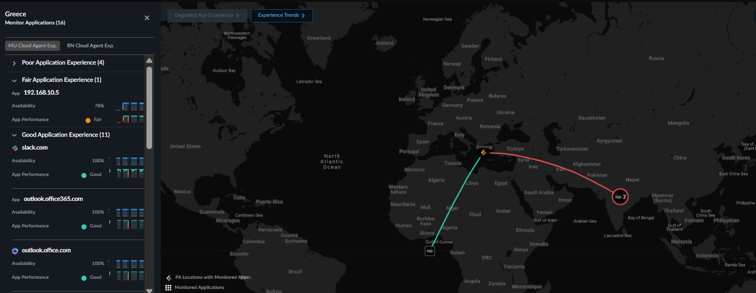 See the application availability metrics in the Monitored Applications tab of the NetSec Health dashboard. This dashboard shows you how many applications are monitored through AI-Powered ADEM and how many of them are experiencing a degraded score. This number takes into consideration the application experience for both mobile users and remote sites. The dashboard shows health and performance of mobile users and remote sites cloud agents in Prisma Access locations. Applications with Poor or Fair application experience scores are considered as degraded experience. You can also see the application's availability during the time range you select using the filter.