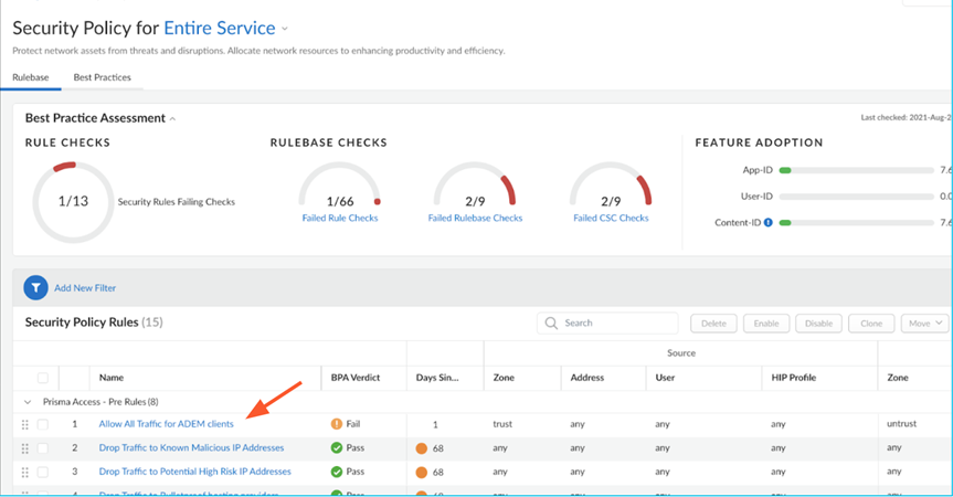 You must add the ADEM URLs to make the endpoints register to the ADEM portal.- Add a security profile for your access experience agent registration. You will need to create a security policy for it.Click Allow All Traffic for ADEM clients.