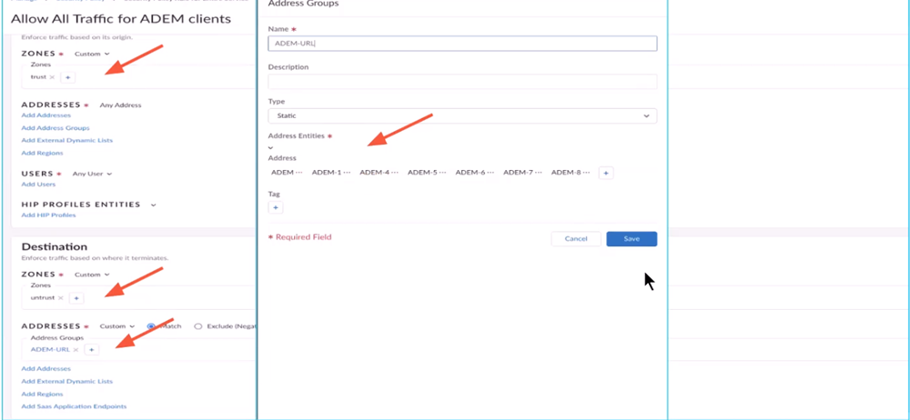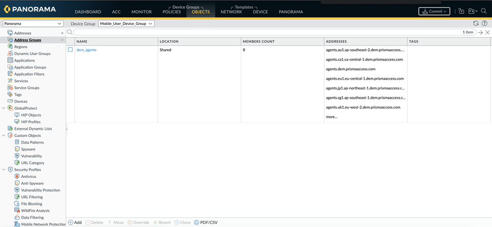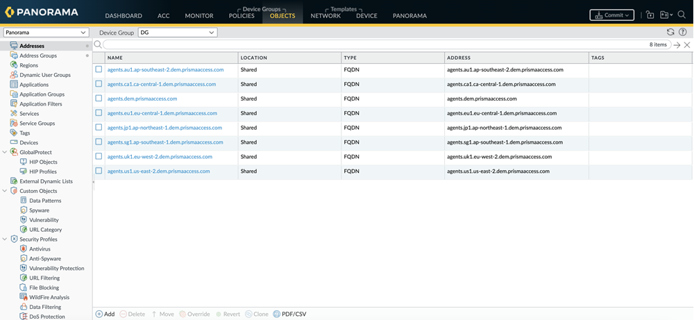 The Autonomous DEM Allocation column will be visible only if you have purchased the ADEM for Remote Networks license.Click OK.Add the following URLs to make the SD-WAN site register to the ADEM portal:- In Panorama, go to Objectsaddresses. Click on Add and add the following ADEM Service Destination FQDNs.