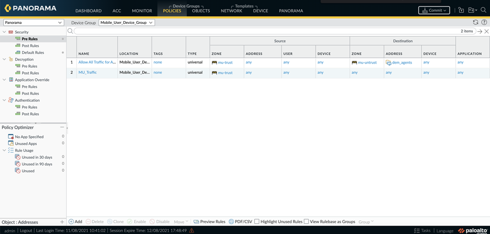 - Add the address group you just created into the security policy. Go to PoliciesSecurityPreRules. Click Add and add the address group to the policy.