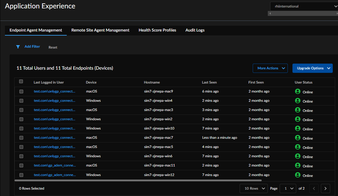 - Enable ADEM for your Prisma Access mobile users.ADEM is supported for your Prisma Access mobile users with Windows or MacOS endpoints running GlobalProtect version 5.2.11 or later.After you enable ADEM for a user, the ADEM configuration will be pushed to the GlobalProtect app the next time the user connects and the app will register with the ADEM service.To see all registered ADEM users, from the Prisma Access app on the hub:Select System SettingsApplication ExperienceApplication Experience Agent Management.This tab shows all registered ADEM users and indicates whether the user is online (the user device is sending keep-alive messages to the ADEM service) or offline (the ADEM service has not received a keep-alive message from the user device in the last ten minutes), when the user device was last seen, the username, device type, and hostname of the ADEM user, and what ADEM agent version they are running.
