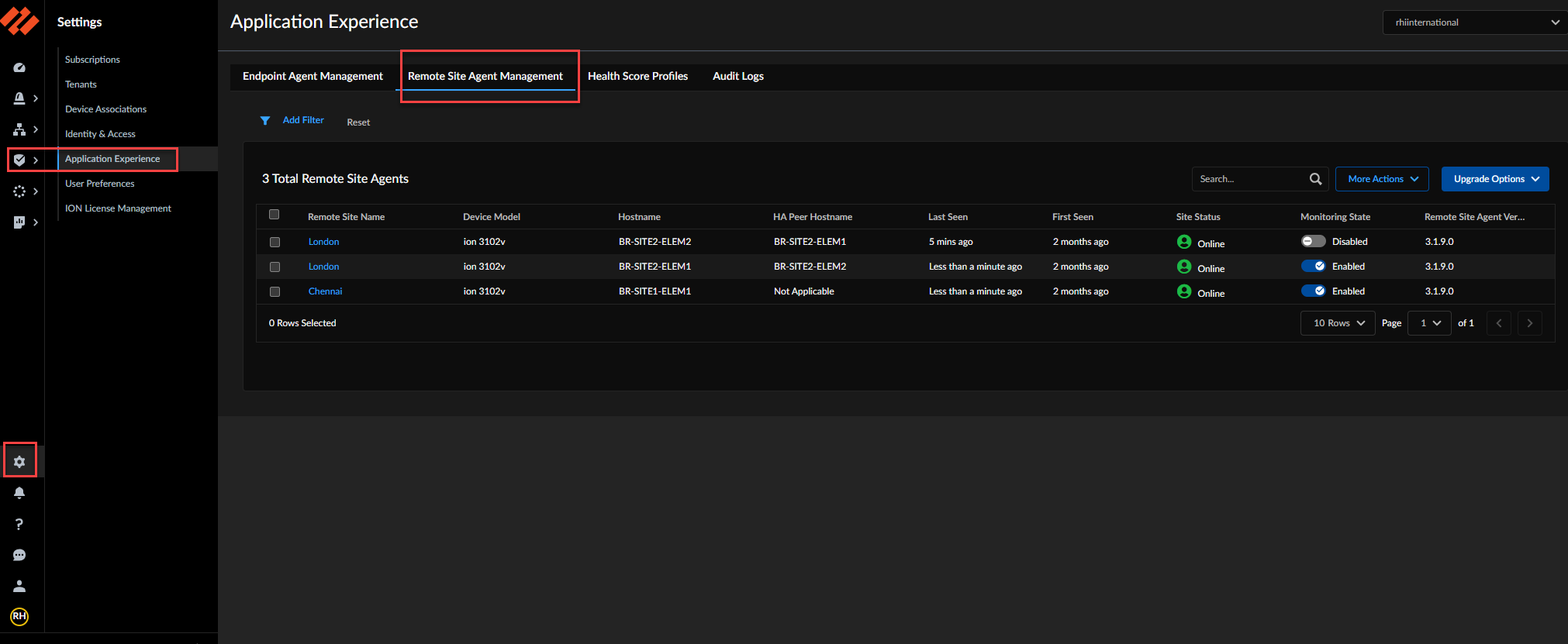 Use the following steps to begin monitoring your remote sites’ digital experiences with ADEM:- Enable ADEM for your Prisma Access remote sites.ADEM for Remote Sites can be enabled only if aggregate bandwidth is enabled on Prisma Access. ADEM is supported for your Prisma Access and Prisma SD-WAN remote sites on all the ION platforms running version 5.6.1 and above.After you enable ADEM on Prisma Access with aggregate bandwidth enabled on the compute location, the ADEM configuration will be pushed to the Prisma SD-WAN remote site devices allowing the remote sites to register with the ADEM portal.To see all registered ADEM users from the Prisma Access app on the hub.Select System SettingsApplication ExperienceRemote Site Agent Management.This tab shows a list of all the remote sites. These sites will have the same names that you have configured on your Prisma SD-WAN remote sites. It also displays the model number, the host name, if they are configured for high availability, and whether they are online. You can enable or disable monitoring for each site and you can delete them also from this tab.Application tests are always executed from the devices that are active on the remote sites. The devices are registered and tests executed on them based on the site name regardless of the appliance on which the tests are running. As long as the devices are a part of the same remote site, all the configurations are tracked based on the site name. So, even if you change your device at a later time, as long as the device is on the same remote site, ADEM will continue to run the tests on them.