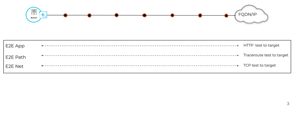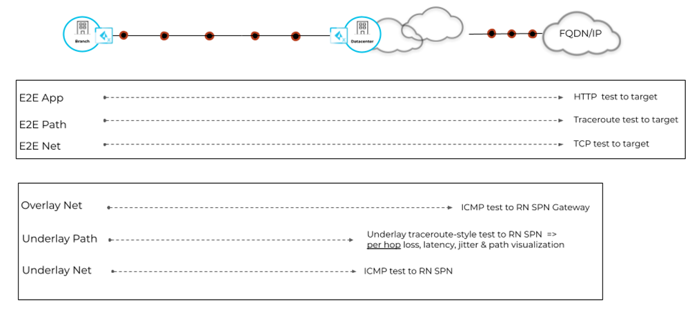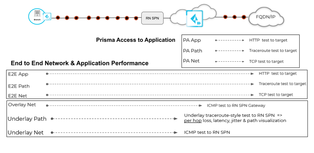 - Synthetic Monitoring—The ADEM-enabled SD-WAN site and the cloud agents within Prisma Access use synthetic tests to baseline end-to-end network quality metrics—latency, jitter, and loss—for each segment from the remote site to the monitored applications on all WAN paths (active and backup). In addition, ADEM-enabled SD-WAN site and the cloud agents within Prisma Access also use synthetic tests to collect web performance metrics, which capture metrics about the HTTP and HTTPS transactions to a specific application, including application availability and uptime, DNS lookup, TCP Connect, SSL connect, HTTP latency, Time-to-First-Byte, Data Transfer rate and Time-to-Last-Byte.Because the synthetic tests are layered, they give a good baseline view of the digital experience segment-by-segment across all monitored applications, and allow you to quickly visualize when and where a change occurred that led to degradation of your users’ digital experience.An ADEM enabled SD-WAN site can monitor all WAN paths (active and backup) based on forwarding policies configured on the SD-WAN. It can monitor Prisma Access path, Secure Fabric path as well as Direct access path.