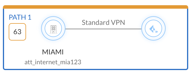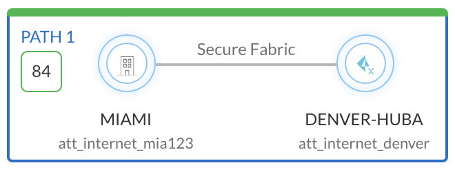 The Secure Fabric path forms a tunnel to the Prisma SD-WAN in the data center. In addition to the path type, this widget shows you the remote site name and the data center where the tunnel is terminating. It also displays the source circuit name extracted from the remote site connected and the destination circuit name in the data center.