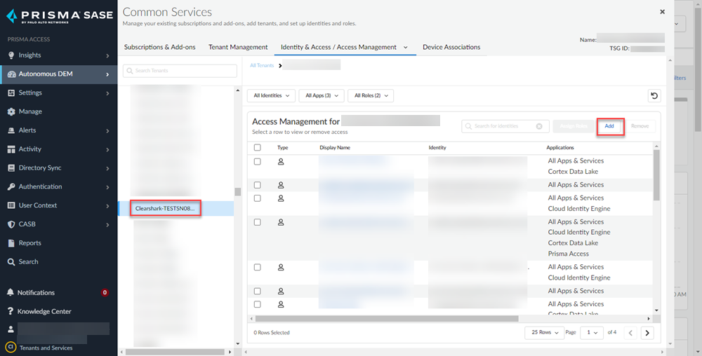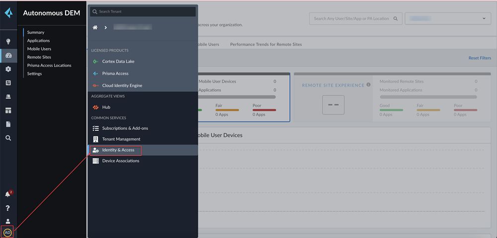 - On the bottom left corner of the left pane in the Prisma SASE user interface, click Tenants and ServicesIdentity & Access under Common Services.