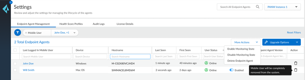 - Enable ADEM for your Prisma Access mobile users.ADEM is supported for your Prisma Access mobile users with Windows or MacOS endpoints running GlobalProtect version 5.2.11 or later.The steps for enabling ADEM for your users depends on if you are using Panorama Managed Prisma Access or Cloud Managed Prisma Access. After you enable ADEM for a user, the ADEM configuration will be pushed to the GlobalProtect app the next time the user connects and the app will register with the ADEM service.To see all registered ADEM users, from the Prisma Access app on the hub:Select Autonomous DEMSettingsEndpoint Agent Management.This tab shows all registered ADEM users and indicates whether the user is online (the user device is sending keep-alive messages to the ADEM service) or offline (the ADEM service has not received a keep-alive message from the user device in the last ten minutes), when the user device was last seen, the username, device type, and hostname of the ADEM user, and what ADEM agent version they are running.