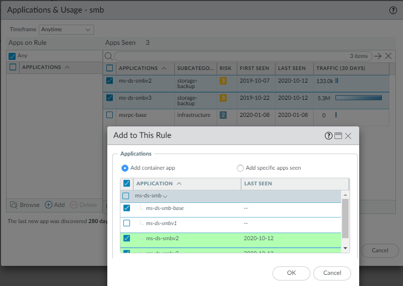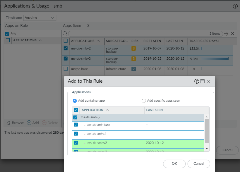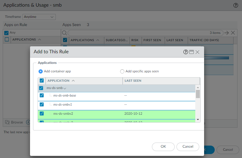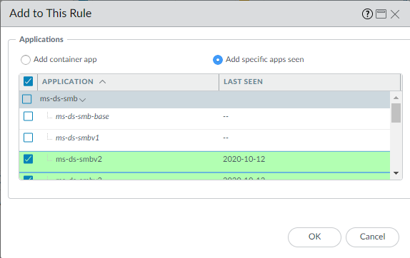 - Select the applications you want to allow and then click Add to This Rule.For example, if you decide not to allow msrpc-base and select only ms-ds-smbv2 and ms-ds-smbv3 and Add to This Rule, Policy Optimizer shows you the related applications in the container app (ms-ds-smb, shaded gray) and provides the opportunity to future-proof the rule by the container app with all of its current and future applications: