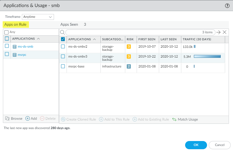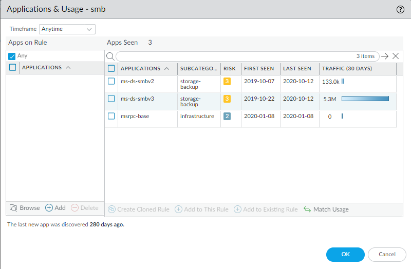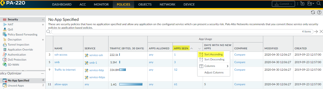 The port-based rules that have seen the fewest applications are at the top of the No App Specified display. You can safely convert rules for specific services, such as SSH, directly to application-based rules and you can examine rules that have seen few applications to see if you can safely convert them.The port-based rule intended to allow Server Message Block (SMB) traffic has seen only three applications since migrating the configuration to the PAN-OS appliance and therefore is a candidate for conversion. - Click the Apps Seen number or Compare to