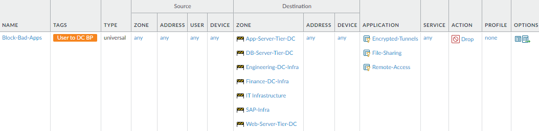 - Block applications you never want in your data center, such as evasive and commonly exploited applications and applications not required for business. Place this rule after the application allow rules so that, for example, you allow sanctioned file sharing applications before the Filesharing application filter blocks all other file sharing applications.