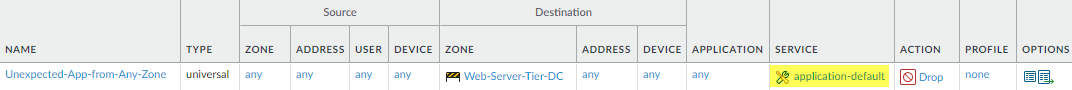 - Block all applications from any zone on the application-default port to identify unexpected applications on standard ports. Rule matches may indicate potential threats or application changes that require modifying an allow rule. Place this rule after the application allow rules and the preceding block rule.