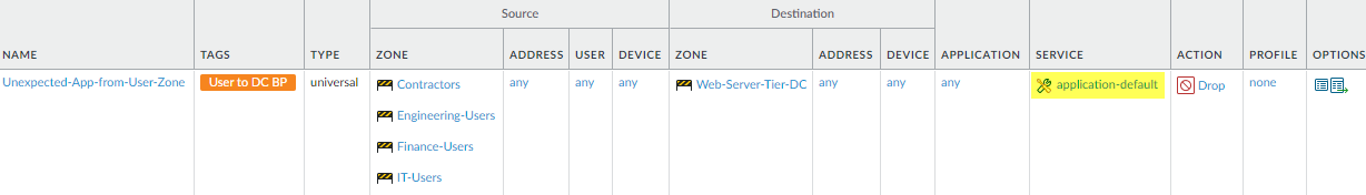 - Block all applications from user zones on the application-default port. Place this rule after the rules that allow legitimate application traffic from user zones to identify unknown or unexpected user applications on standard ports.