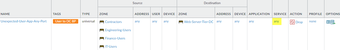 - Block all applications from user zones on any port to catch user traffic attempting to use non-standard ports. Place this rule after the preceding application-default block rule to identify unknown or unexpected user applications on non-standard ports, which may be custom applications or evasive applications.
