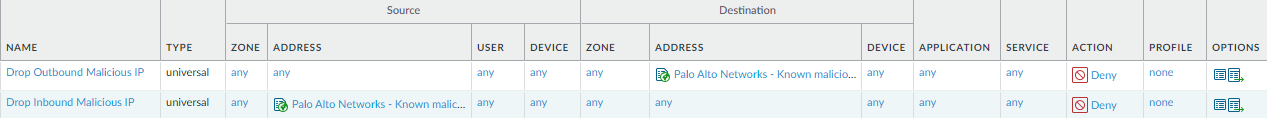 - Block traffic to and from IP addresses that Palo Alto Networks identifies as malicious.