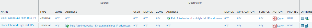 Block and log traffic to and from high-risk IP addresses from trusted threat advisories.Why Do I Need These Rules? Rule Highlights Although Palo Alto Networks has no direct evidence of the maliciousness of the IP addresses in the high-risk IP address feed, threat advisories have linked them to malicious behavior.- Block and log the traffic as shown in this example.