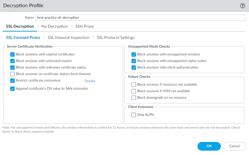 Enable both CRL and OCSP certificate revocation checking because server certificates can contain the CRL URL in the CRL Distribution Point (CDP) extension or the OCSP URL in the Authority Information Access (AIA) certificate extension.Although the best practice is to use a proper certificate, some certificates leave the Subject Alternate Name (SAN) field blank, which can cause firewalls to reject those certificates. Check Append certificate’s CN value to SAN extension to automatically copy the certificate number to the SAN field if the SAN field is blank, so that if you do business with sites that don’t populate the certificate’s SAN field, you can accept their certificates. Otherwise, the sites need to regenerate their certificates to conform to proper practice and populate the SAN field.Block all other server certificate verification exceptions. - Unsupported Mode Checks—If you don’t block sessions with unsupported versions and unsupported cipher suites, then users receive a warning message that they can click through to reach the risky website. The reason you configure tight SSL Protocol Settings is to block and protect you from servers that use these weak (risky) protocol versions and algorithms. In addition, blocking sessions with unsupported mode checks protects you from malicious backdoors and other threats that use custom and non-standard encryption to obfuscate their activities.Block sessions with client authentication enables you to choose whether to allow or block sessions that use client authentication. Although server authentication can be the only authentication used to establish a session, some sites use mutual authentication, where both the server and the client authenticate to establish a session. Client authentication using an X.509 Digital Certificate is similar to server authentication in that both methods use a digital certificate issued by a trusted Certificate Authority to authenticate a session. The client certificate acts as a digital identifier for the client, resides on the client device, and can’t be ported to other devices. However, client authentication prevents the firewall from decrypting the session because the firewall needs both the client and server certificates to perform bi-directional decryption, but the firewall only knows the server certificate. This breaks decryption for client authentication sessions.If you don’t enable Block sessions with client authentication, when the firewall attempts to decrypt a session that uses client authentication, the firewall allows the session and adds an entry in its local decrypt exclude cache that contains the server URL/IP address, the application, and the Decryption profile. Entries remain in the cache for 12 hours and then age out. If the same user or a different user attempts to access the server within 12 hours using client authentication, the firewall matches the session to the decrypt exclude cache entry, does not attempt to decrypt the traffic, and allows the encrypted session.If the exclude cache becomes full, the firewall purges the oldest entries as new entries arrive. If you change the Decryption policy or profile, the firewall flushes the exclude cache because changing the policy or profile can change the classification outcome of the session.If you enable Block sessions with client authentication, the firewall blocks sessions that use client authentication, with the exception of sessions from sites on the SSL Decryption Exclusion list (DeviceCertificate ManagementSSL Decryption Exclusion).You may need to allow traffic on your network from other sites that use client authentication in addition to the Predefined sites on the SSL Decryption Exclusion list. Create a Decryption profile that allows sessions with client authentication. Add it to a Decryption policy rule that applies only to the server(s) that house the application. To increase security even more, you can require Multi-Factor Authentication to complete the user login process.For all other traffic, apply the Decryption profile that blocks sessions with client authentication.