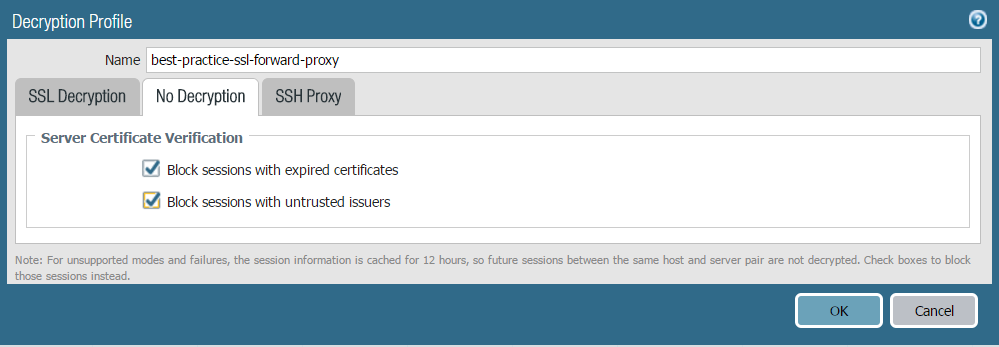 and block sessions that can’t be decrypted.In some cases, the best practice settings depend on your company’s security compliance rules. Apply the SSL Forward Proxy Decryption profile to security policy rules that control outbound traffic.