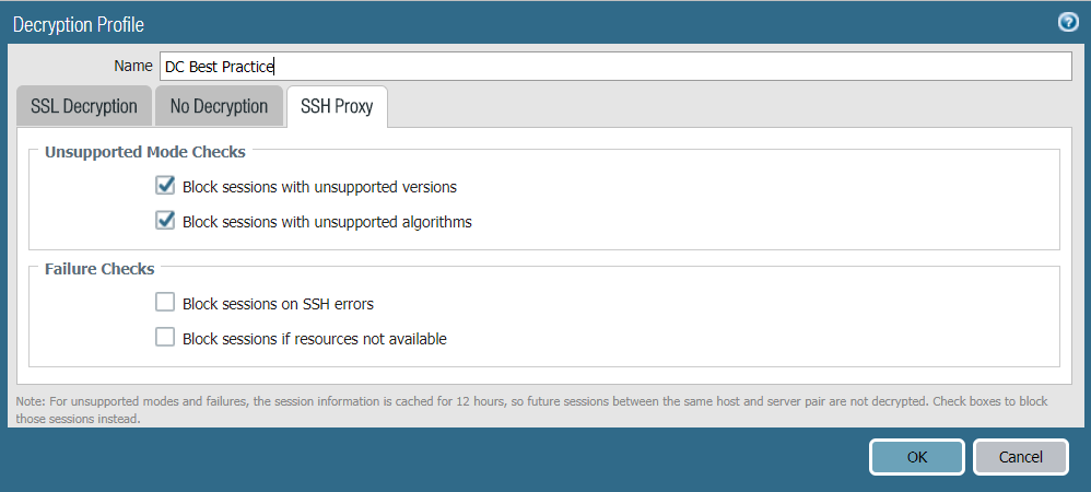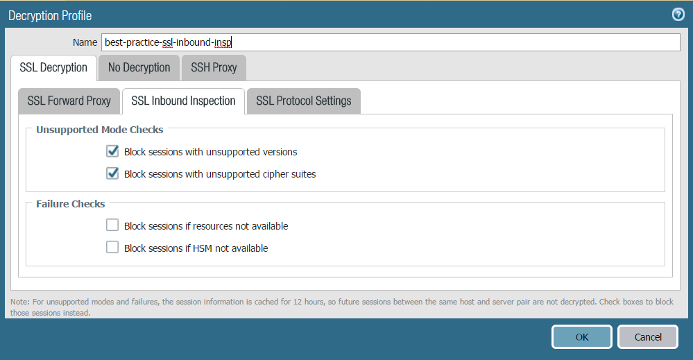 security. If you use a Hardware Security Module (HSM) to store your private keys, whether you check Block sessions if HSM not available depends on your compliance rules about where the private key must come from and how you want to handle encrypted traffic if the HSM isn’t available. For example, if your company mandates the use of an HSM for private key signing, then block sessions if the HSM isn’t available. However, if your company is less strict about this, then you can consider not blocking sessions if the HSM isn’t available. (If the HSM is down, the firewall can process decryption for sites for which it has cached the response from the HSM, but not for other sites.) The best practice in this case depends on your company’s policies. If the HSM is critical to your business, run the HSM in a high-availability (HA) pair (PAN-OS 8.0 supports two members in an HSM HA pair).
