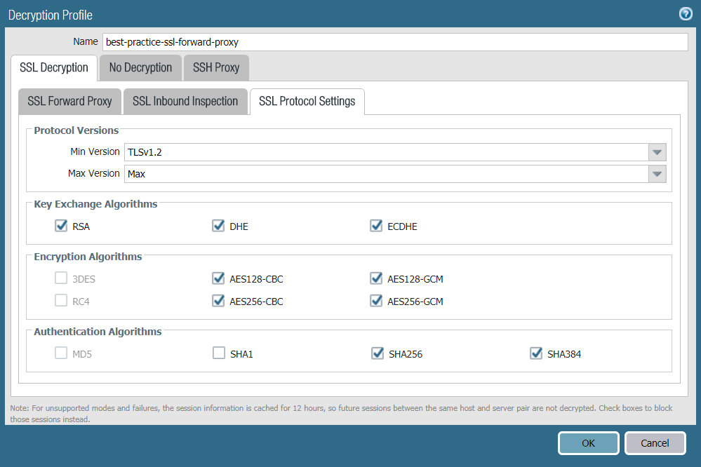 Set the Min Version to TLSv1.2 to provide the strongest security—business sites that value security support TLSv1.2. If a site (or a category of sites) only supports weaker ciphers, review the site and determine if it really houses a legitimate business application. If it does, make an exception for only that site by configuring a Decryption profile with a Min Version that matches the strongest cipher the site supports and applying it to a Decryption policy rule that limits the weak cipher to only the site or sites in question. If the site doesn’t house a legitimate business application, don’t weaken your security posture to support the site—weak protocols (and ciphers) contain known vulnerabilities that attackers can exploit. If the site belongs to a category of sites that you don’t need for business purposes, use URL Filtering to block access to the entire category. Don’t support weak encryption or authentication algorithms unless you must do so to support important legacy sites.Set the Max Version to Max rather than to a particular version so that as the protocols improve, the firewall automatically supports the newest and best protocols. Whether you intend to attach a Decryption profile to a Decryption policy rule that governs inbound (SSL Inbound Inspection) or outbound (SSL Forward Proxy) traffic, avoid allowing weak algorithms. - Configure the SSL DecryptionSSL Forward Proxy settings