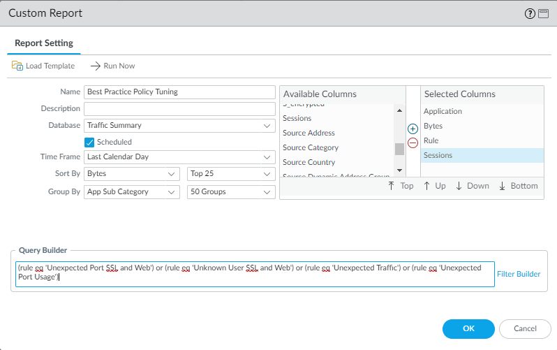 - Select MonitorManage Custom Reports.Add a report and give it a descriptive Name that indicates the policy gap you're investigating.Set the Database to Traffic Summary.Select Scheduled.Add Rule, Application, Bytes, Sessions to the Selected Columns list.Set the desired Time Frame, Sort By, and Group By fields.Define the query to match traffic that matches the rules which find policy gaps and alarming behavior. You can create a single report which details traffic that matches any of the rules (using the or operator) or create individual reports to monitor each rule. The following example queries use the rule names defined in the example policy: