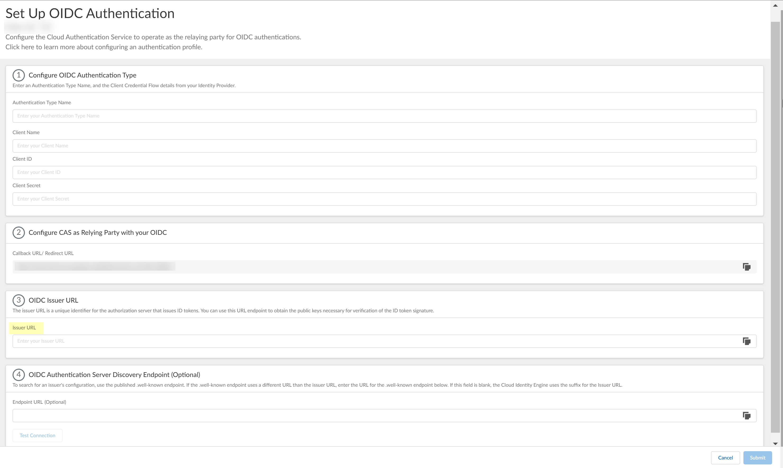 (Optional) If you have your Endpoint URL, enter it here. If not, continue to the next step (the Cloud Identity Engine populates the Endpoint URL automatically after you successfully test the connection).