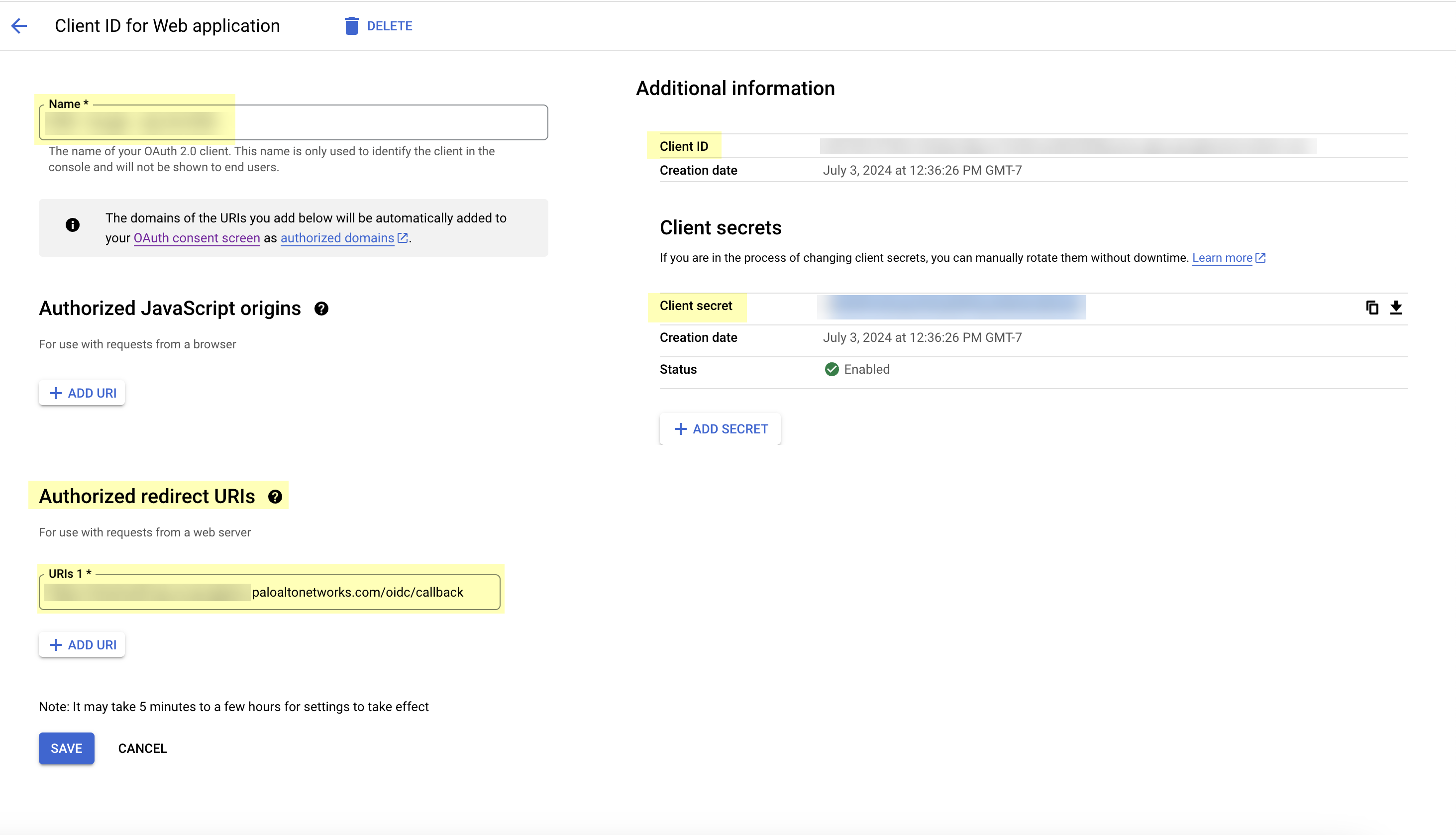 Create a new project or select an existing project.Enable the Identity and Access Management (IAM) API (if it's not already enabled).Select APIs & ServicesOAuth consent screen then configure the OAuth consent screen.Create your OAuth 2.0 credentials, copy the Client ID and Client Secret, and store them in a secure location.Don’t allow the client secret to expire. If the client secret isn’t up to date, users can’t log in using OIDC.Obtain the information you need to complete your OIDC Google configuration and enter it in your Cloud Identity Engine configuration.- Copy the following information from your configuration and save it in a secure location: