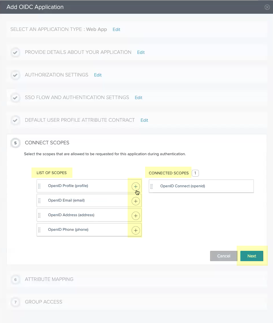 Add all the scopes in the List of Scopes to the Connected Scopes then click Next.