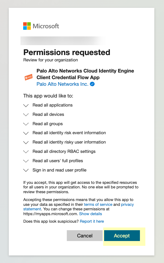 Click Accept to grant the necessary permissions for your Azure directory.When you accept, Azure automatically enables the following required permissions, as well as the additional information type permissions listed in step 3:- Device.Read.All—Application, Read all devices