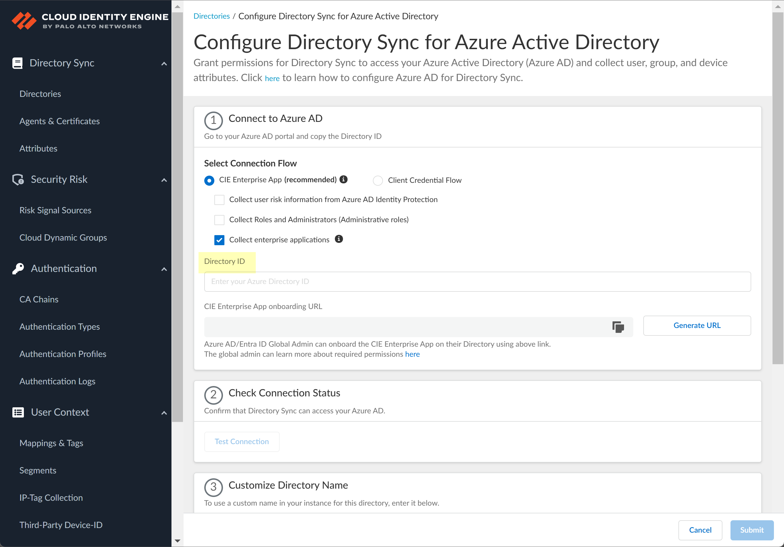 Configure your Azure directory information in the Cloud Identity Engine.- Enter the directory ID you copied in step 1.2 as the Directory ID.