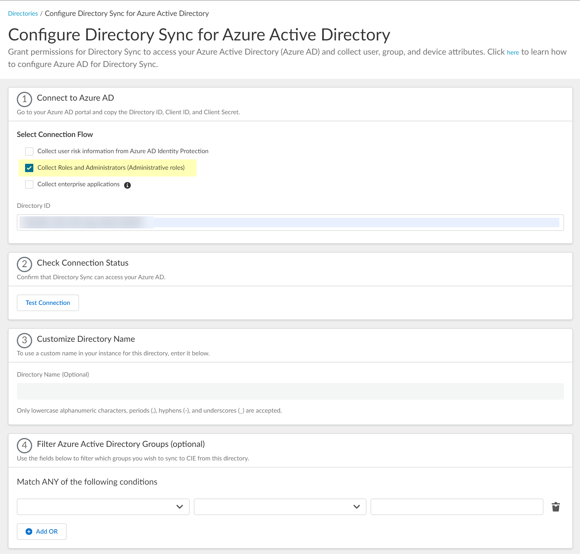If you do not see the Collect Roles and Administrators (Administrative roles) option, reconnect your directory to select the option.Select whether you want to Collect enterprise applications data so that it displays when you View Directory Data. If you don't want to collect the application data or you don't use application data in your security policy, deselect the checkbox to decrease the sync time. If you select this option, you must enable additional permissions for the Cloud Identity Engine (see step 2.6).For beta users of this feature, the Cloud Identity Engine continues collecting enterprise application data for any directories configured in your tenant during the beta and no further configuration is required. If you configure a new directory, you must select whether you want to collect enterprise application data from the new directory.