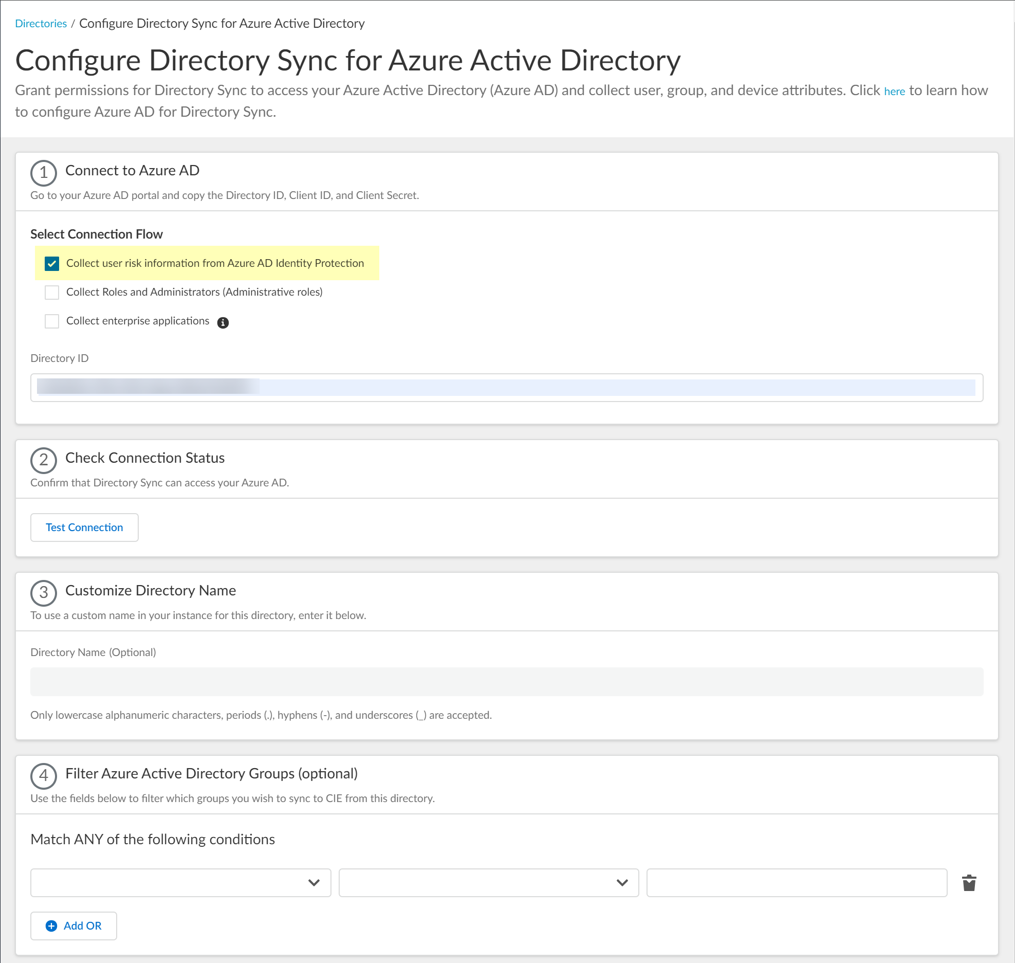Select whether you want to Collect user risk information from Azure AD Identity Protection to use in attribute-based Cloud Dynamic User Groups.If you select this option, you must grant additional permissions for the Cloud Identity Engine in the Azure AD Portal. For more information, refer to the documentation for Cloud Dynamic User Groups.