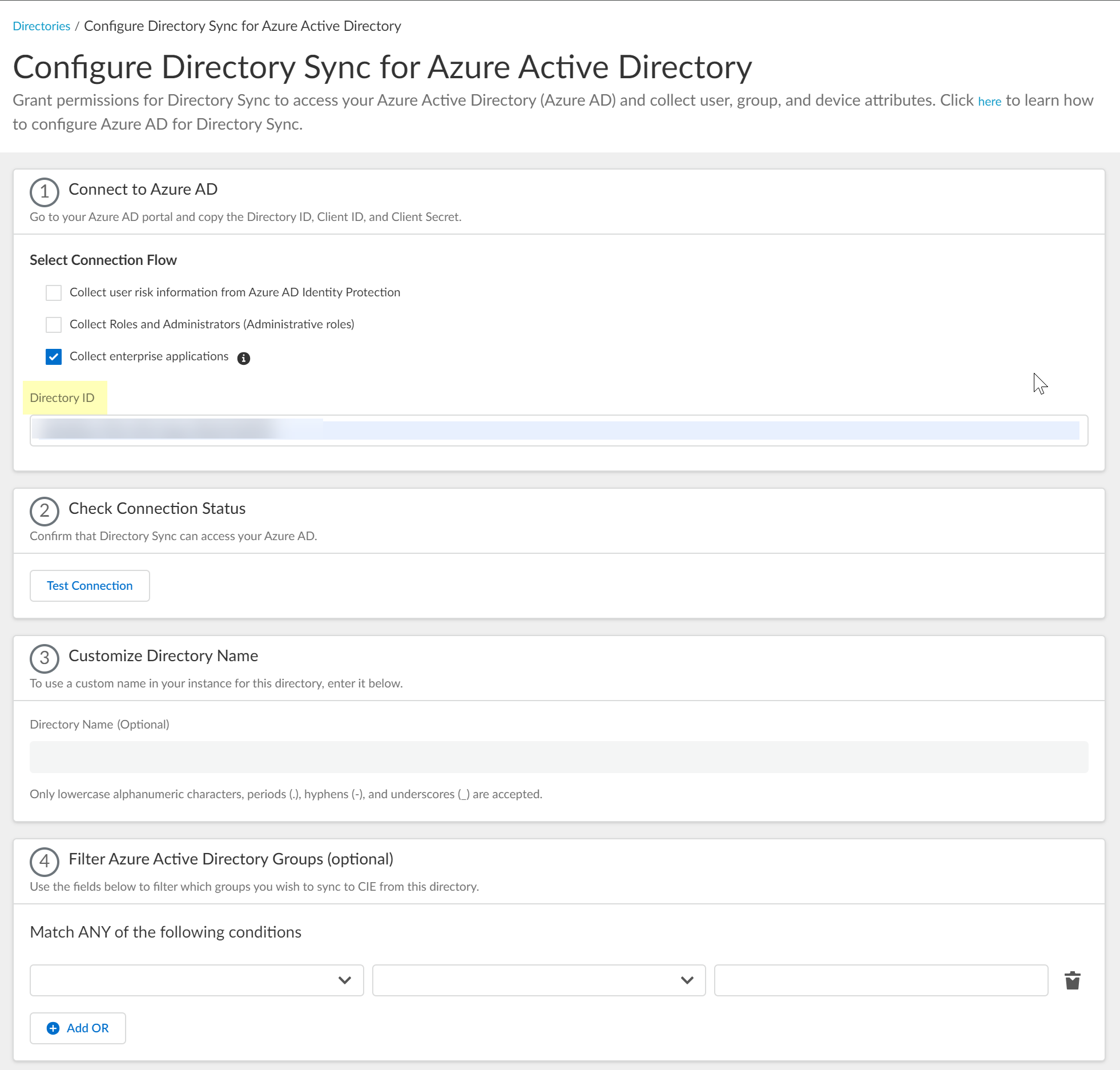 (Required) Confirm the Cloud Identity Engine app can successfully communicate with your directory.- In the Cloud Identity Engine, click Test Connection to confirm that the Cloud Identity Engine can successfully connect to your Azure AD.