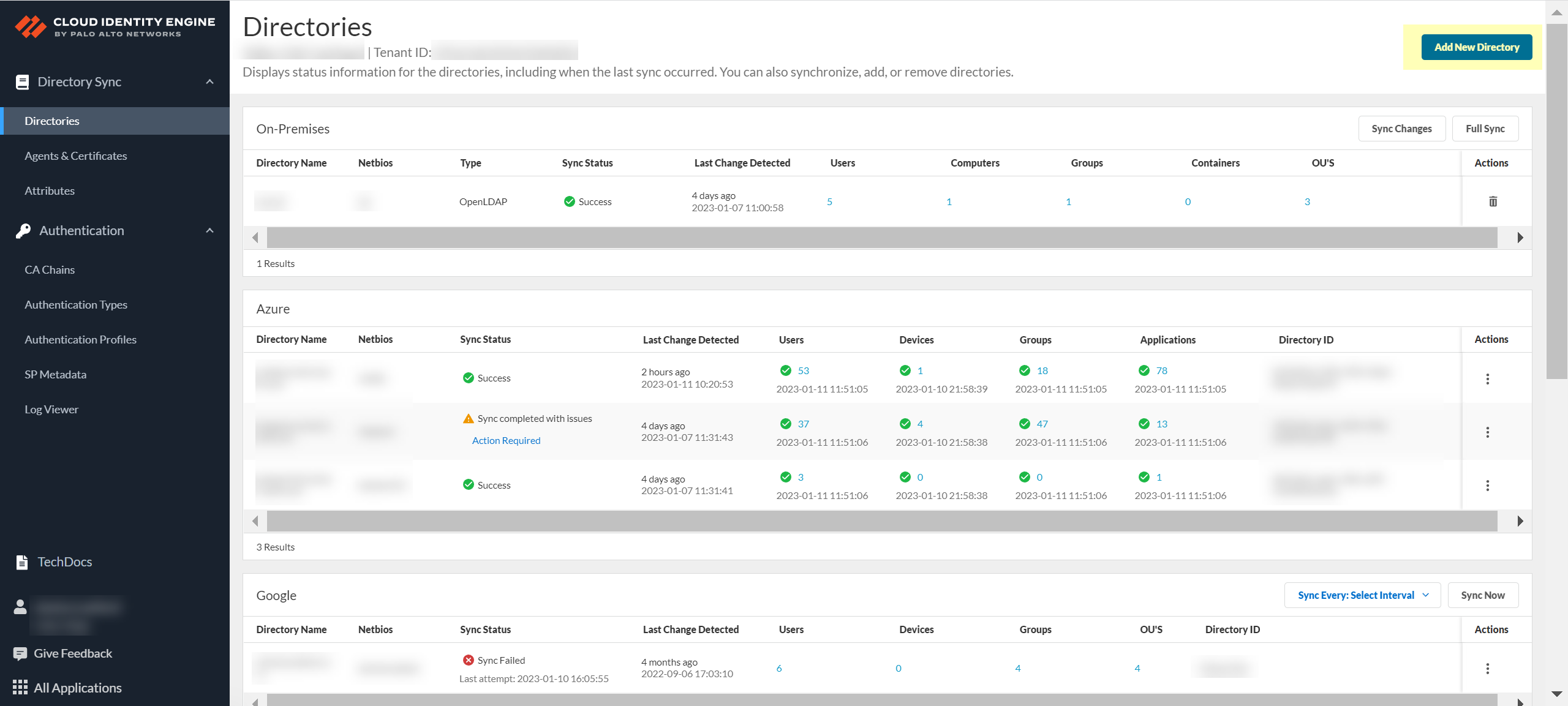 - Log in to the hub and select the Cloud Identity Engine app.Select Directories then click Add New Directory.